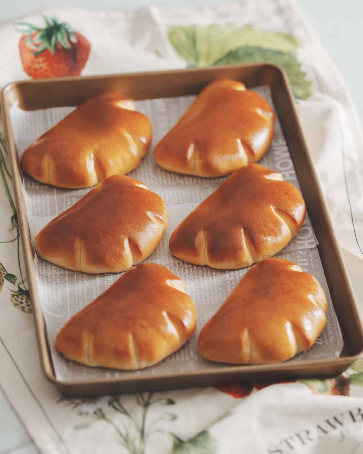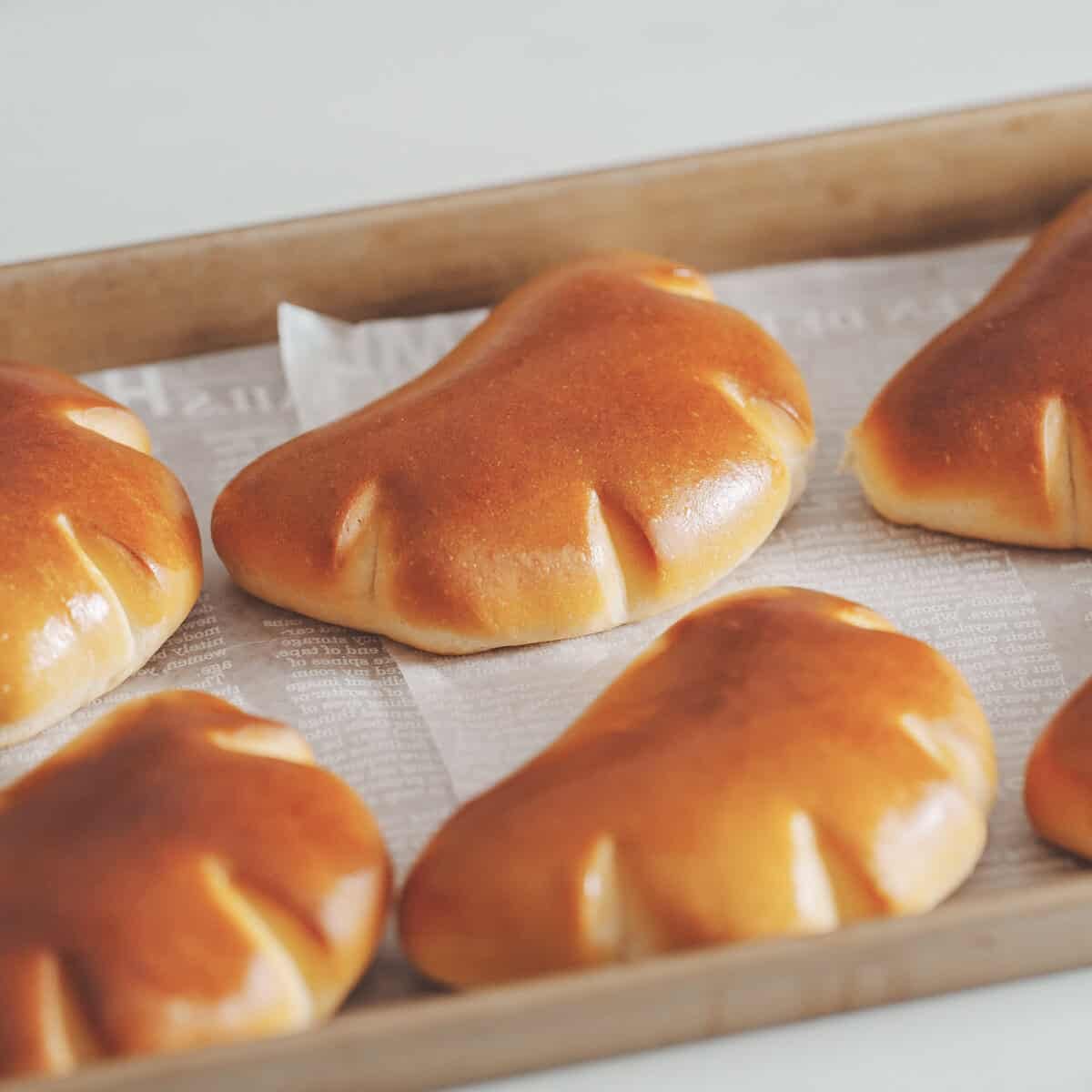 - 提起麵皮覆蓋餡料並按壓邊緣,用刮板輕壓幫助密封,為避免烘烤時爆餡,可翻面再捏緊一次增加穩定度;造型可選擇表面剪 4 刀(約 1 cm 深)